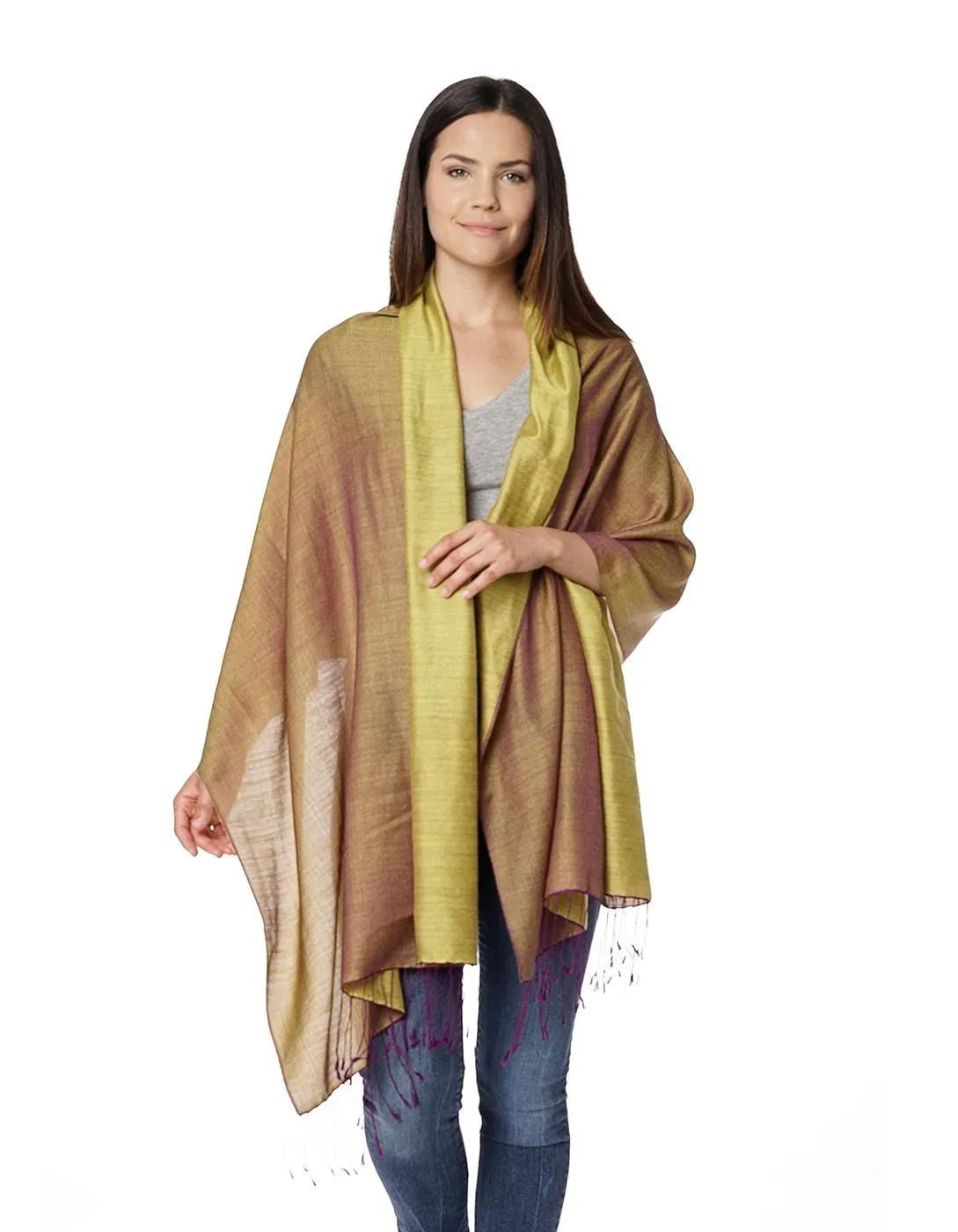 We saw these unusual iridescent shawls in Thailand two years ago, but it took us some time to track them down to Nepal. These exquisitely soft lightweight shawls change color as they shimmer in the light. Warp is silk, weft is polyester microfiber with hand-Knotted tassles. Wear them as a shawl or an extravagant neck-scarf. Unique two-tone wraps in 13 different colors.
